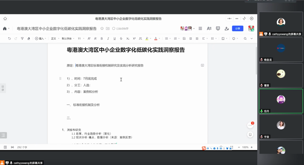 本次会议对粤港澳大湾区标准衔接机制研究框架及粤港澳大湾区中小企业数字化低碳化实践案例报告进行了充分沟通,对包括衔接机制概念、衔接机制的主要内容及中小企业数字化案例梳理工作等内容达成共识并明确分工和时间表,为项目后续研究工作的开展提供了较为清晰的思路和路径。